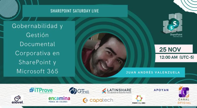 En cuanto el segundo evento, éste es parte de Microsoft 365 Live, pero será una jornada completa dedicada completamente a SharePoint, te recomendamos especialmente asistir, ya que este sábado 25 de noviembre estará nuestro co-fundador Juan Andrés Valenzuela como speaker con su sesión sobre "Gobernabilidad y Gestión Documental Corporativa en SharePoint y Microsoft365"